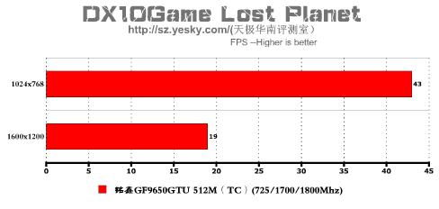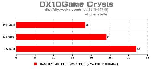 铭鑫视界风PK版GF9650GTU 512MB(TC)显卡在此项测试中的表现可圈可点,毕竟对于一款低端产品来说,铭鑫GF9650GTU显卡在这苛刻的游戏中能达到平均30FPS以上(1024x768,效果全部调为中等),基本能较为流畅地运行。