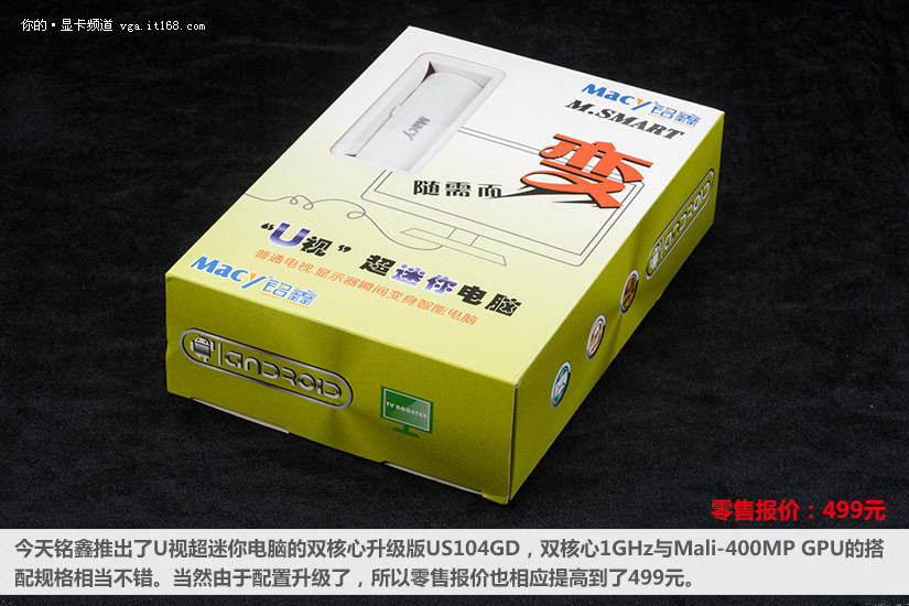 在去年,铭鑫推出的一款U视超迷你电脑US104G凭借着体积小巧,功能强大,而且支持Android 4.0.4系统而大受欢迎。今天铭鑫推出了其双核心升级版US104GD,双核心1GHz与Mali-400MP GPU的搭配规格相当不错。只需将铭鑫U视超迷你电脑插入电视的HDMI端口,电视便能运行成千上万最新、最热的Android程序。各类游戏、在线视频点播、网页浏览,一棒打尽。