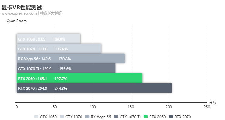 而在VRMark测试中,原本玩VR游戏性能相当紧张的GTX 1060只有83.5fps,而RTX 2060已经是翻倍到了165.1fps,这成绩比GTX 1080还要高,看来Turing显卡针对VR上有了重大优化,如果你平常喜欢玩VR游戏,上RTX 20系列显卡是最明智的选择。