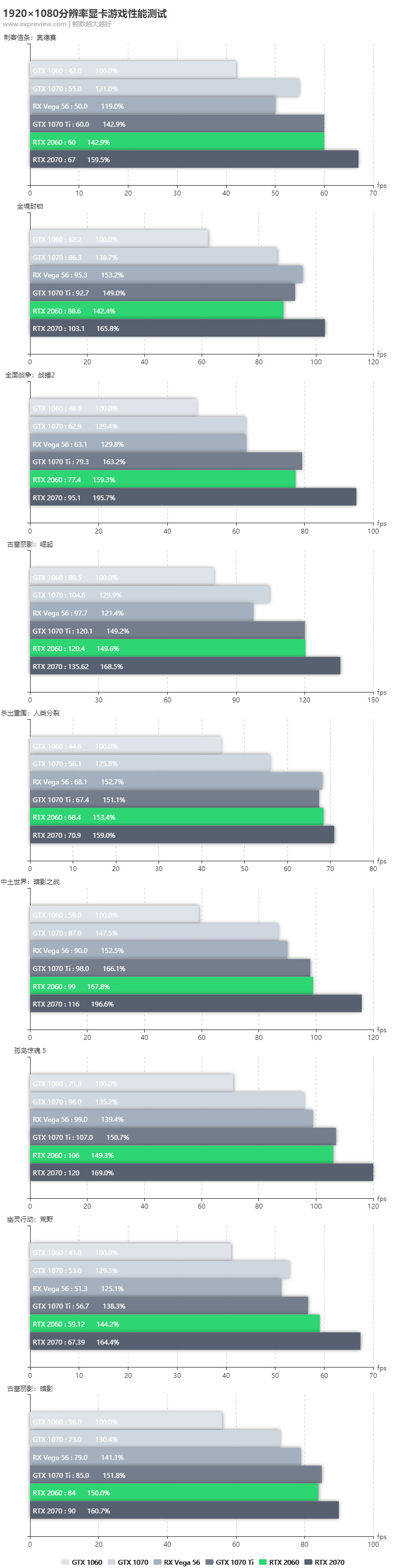 RTX 2060表现实在是太棒了,相对于GTX 1060提升在40-68%左右,表现非常亮眼,很多游戏与GTX 1070 Ti非常接近了。特别是《中土世界:暗影之战》,59fps到99fps是质的飞跃。