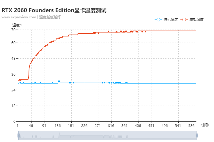 RTX 2060 Founders Edition由于使用同RTX 2070 Founders Edition同款散热方案,热管+铜底散热方案固然没有均热板那么高效,待机温度为29℃,满载下为69℃,表现还不错,比RTX 2070 Founders Edition低个5-6℃还是有的。